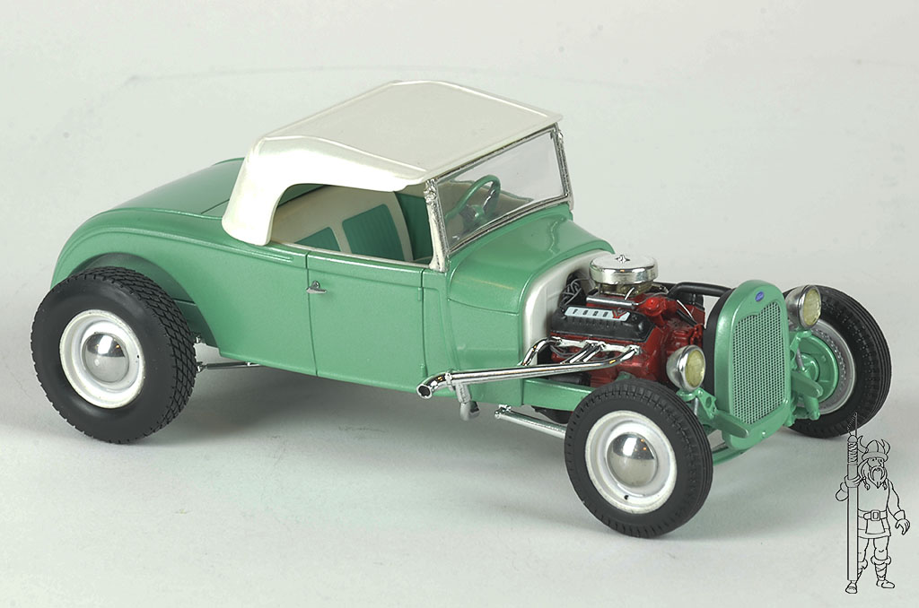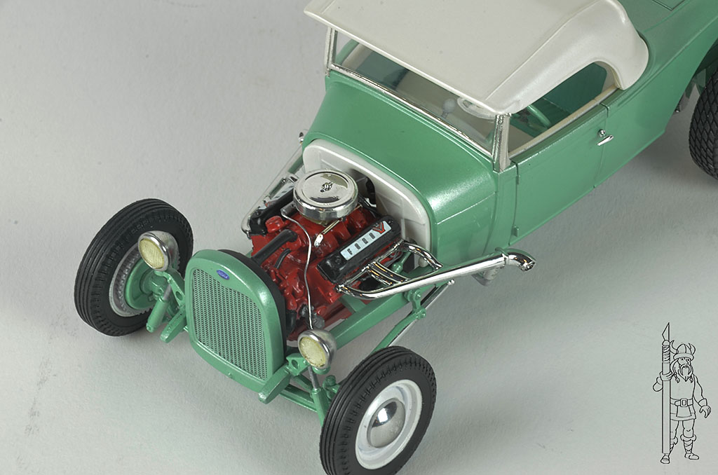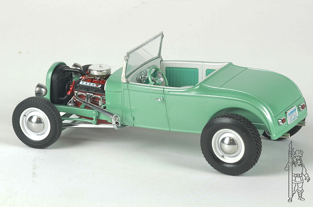 Revell 29 Model A Roadster 2nd issue built as the Channeled version. Added a fully Detailed Ford Y block from the Revell 57 Ford Ranch wagon. Parts by Paks real metal Moon caps for the wheels and Hot Rod headlights up front. Painted in Tamiya Pearl Green over a White primer. No clear as I wanted a soft pearl effect. All the Accent colored parts were painted with Testors one coat White Lightning including the interior. Kit decals for seat inserts and door panels and Kens Fuzzy for the carpet flocking. Optional Drag city resin up top look. The 29 Roadster and 30 coupe are Fun kits to build from Revell.