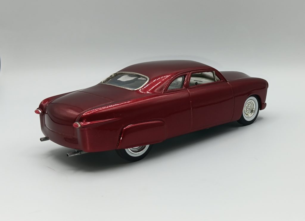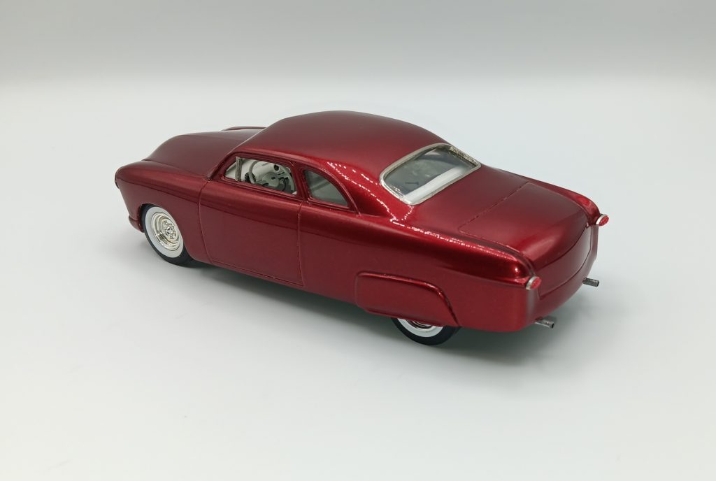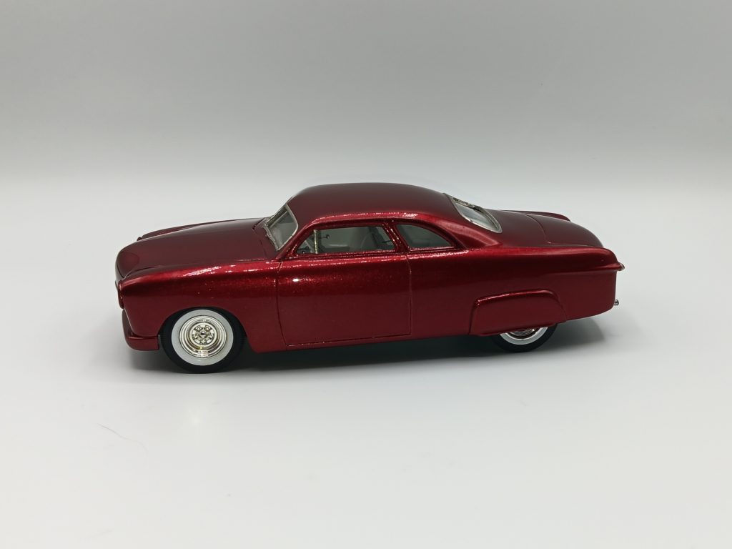 AMT 1949 Ford chopped top resin Jimmy Flintstone body to start. Removed the side trim, nosed and decked. Frenched in headlights, side skirts from the Amt 49 merc. Custom rear rolled pan made by inverted Amt 49 merc kit made to fit. Painted with Duplicolor Red Metal specks and cleared with testors wet look and hand buffed. Built as a curbside, but a fun old school custom.