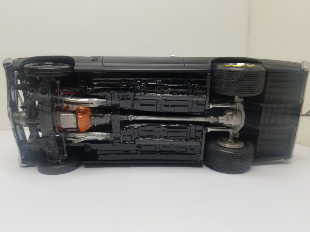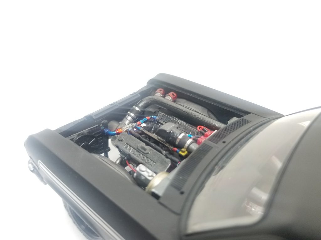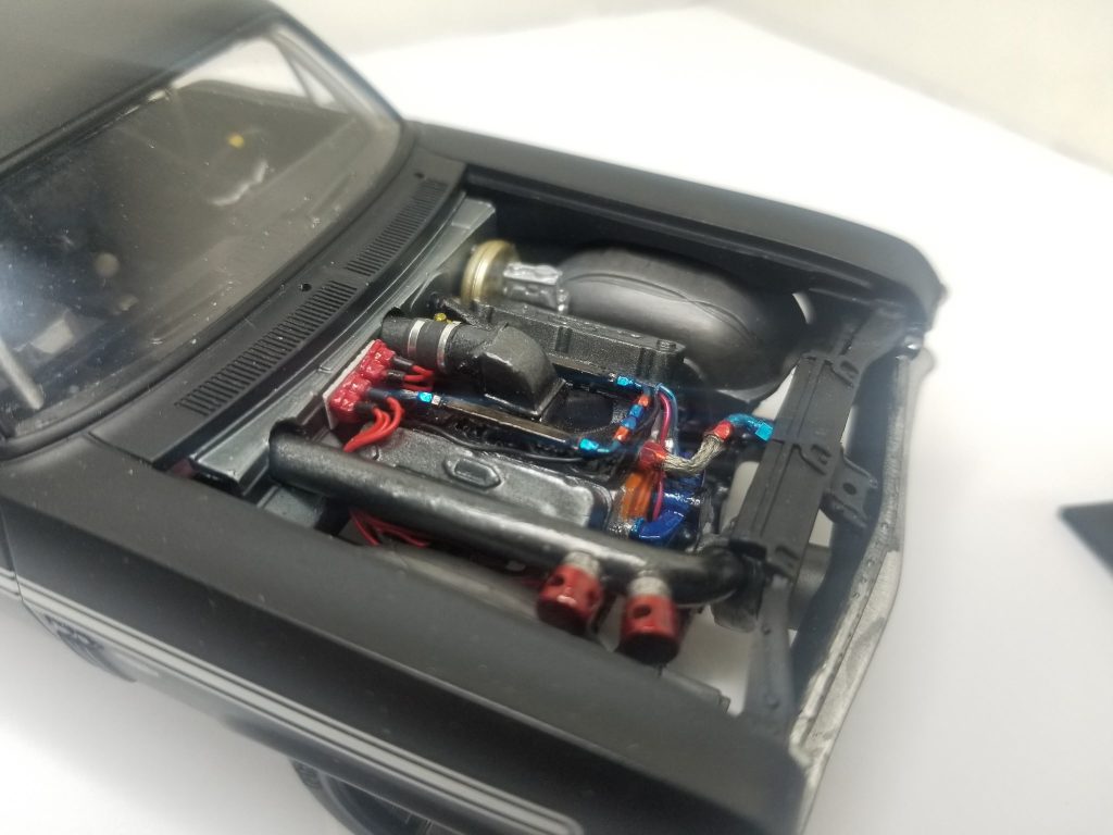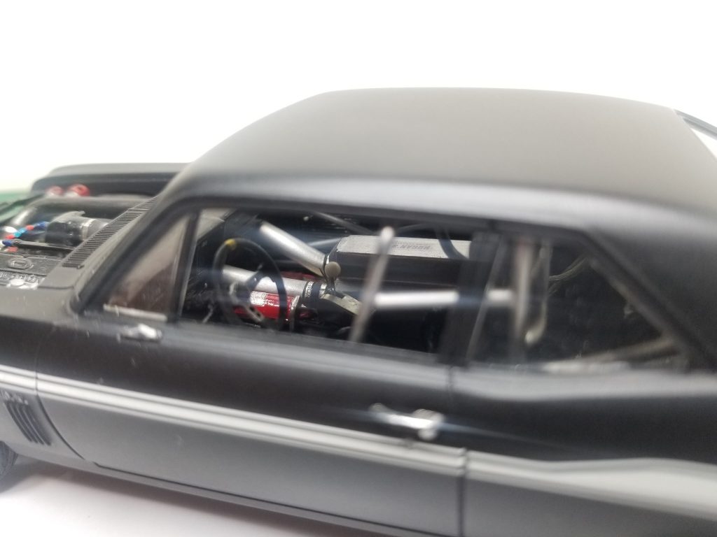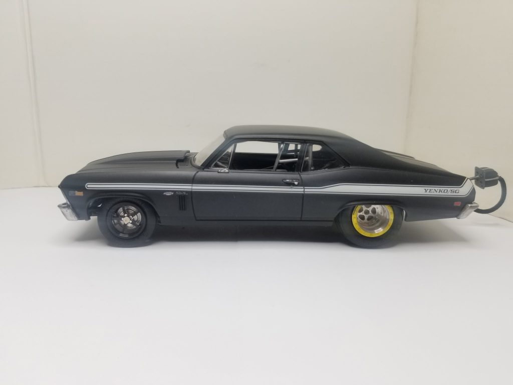 Tony’s 69 nova started out as a fun project and it slowly developed to becoming a 275 extreme outlaw car, the kit is a Revell 1969 Yenko big block Chevy, Tony scratch built the crank drive for F3S procharger including aftercooler in the interior plumbed with all it water lines, blow off valve, he wired and plumbed it, including msd alloy crank trigger, scratch built intake elbow and fuel rails, he also scratch built the full roll cage, The chassis pan is a resin tubbed chassis he bought on eBay. The wheels are pro track in the front, n micro nitro out back, it’s got a Turbo 400 transmission the rearend is from the AMT Super Bee four link suspension aswell, rear tires are small sprint car tires and fronts are pro stock tires, he finish it off with Tamiya matt black and used the kit decals to Yenko it up…