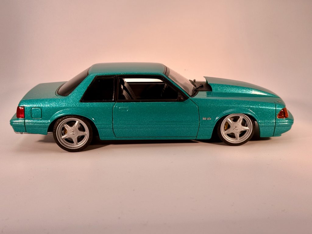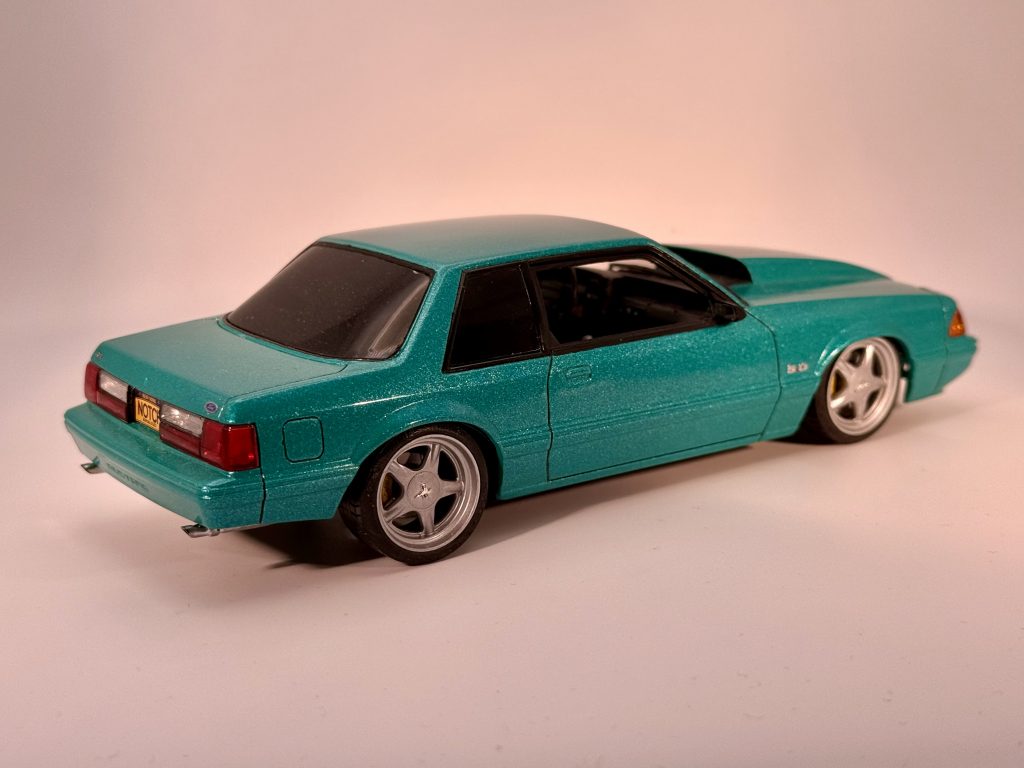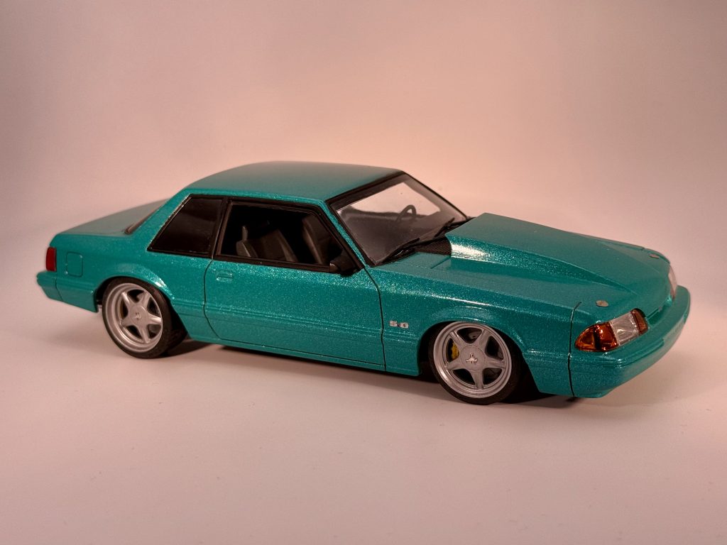 Testor turquoise met and wet look clear. Texas 3D custom pony wheels, 5.0 chrome decals and Ford & LX badges. Parts by Parks Hood Pins.