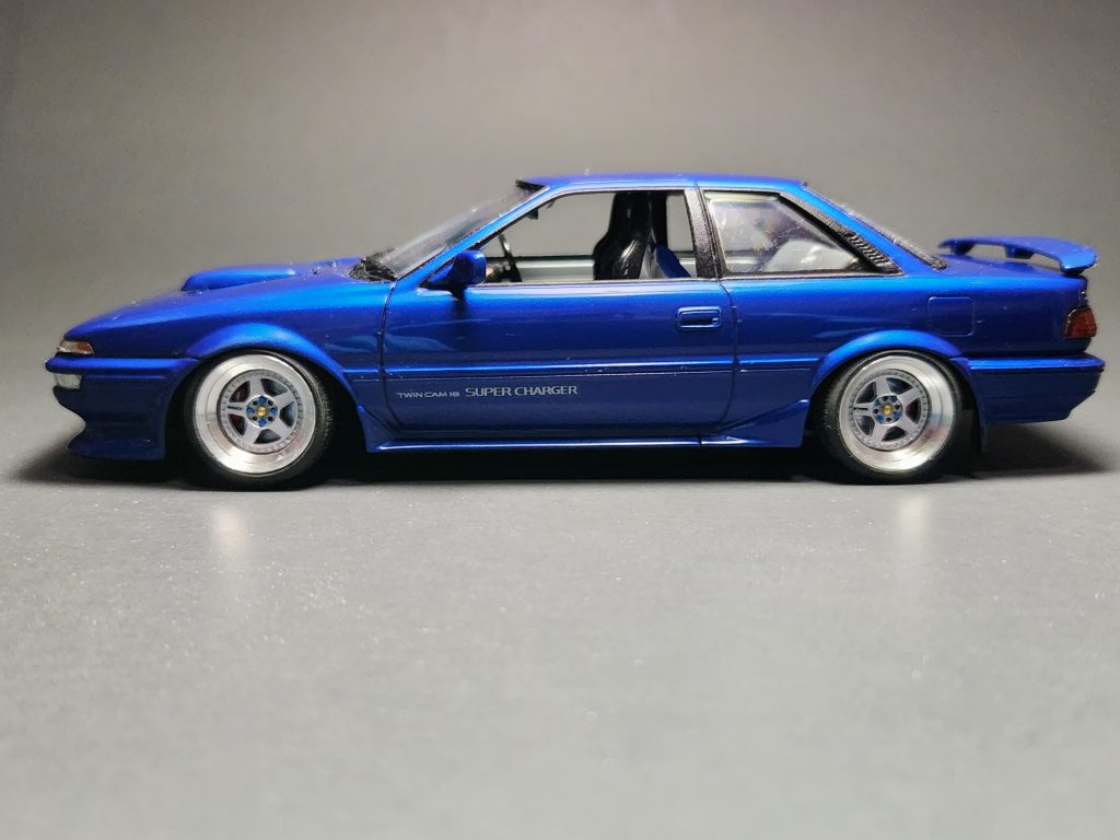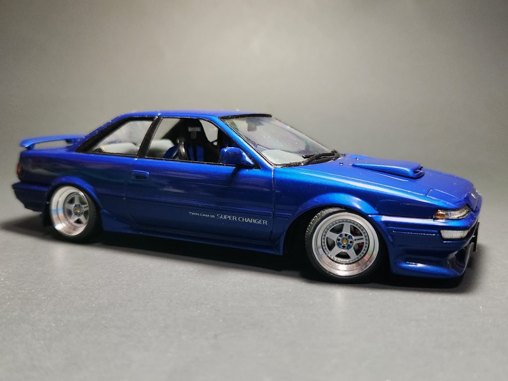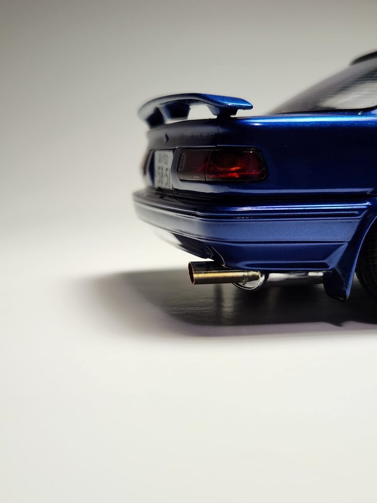 Scratchbuilt interior bits, Fujitsubo Sport exhaust, and Doobie PurpleSpeed front lip spoiler. Painted Tamiya Mica Blue with TS-13 clear. Also added posable steering.