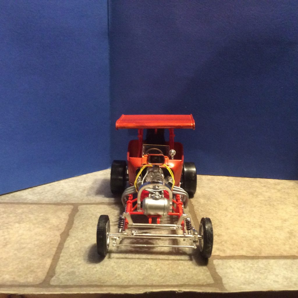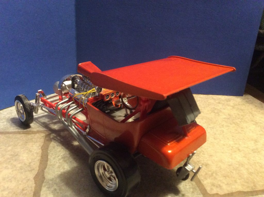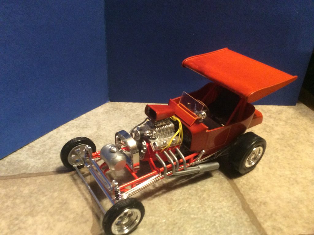 This was built from a MPC 1/20 scale Altered T kit.Mostly built from the box except for adding plug wires and a coil.Frame is testor orange paint.The Body,wing turtle deck and scoop are testors orange pearl.There are also gauge decals added to the tach and dash.