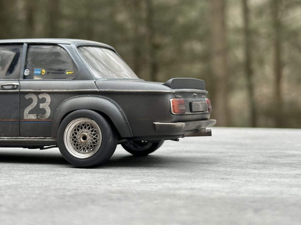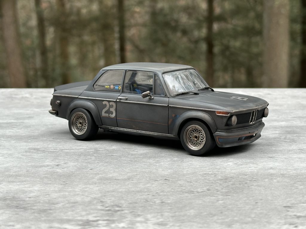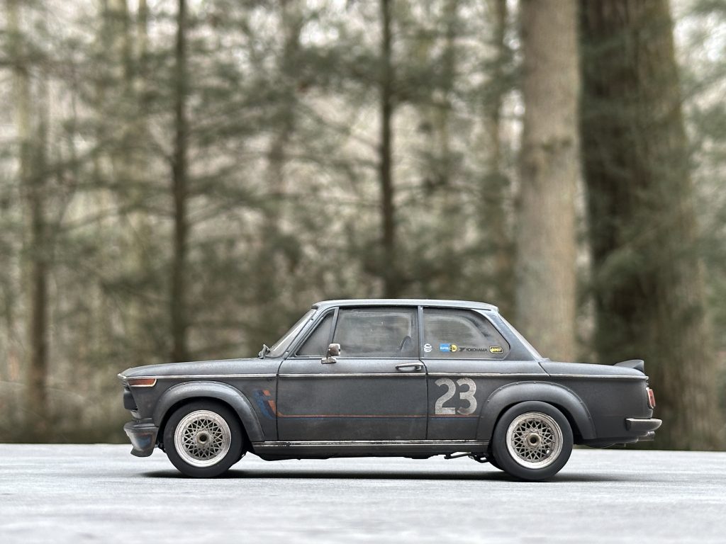 Well, it was a very long, dirty weekend at the race track with this BMW. This is the Hasegawa BMW 2002 Turbo kit. Steve added wheels from HAsegawa E30 M3, scratch built harness bar with harness belts, buckles and an aluminum exhaust tip. The race seats and window decals were from a parts bin. It was a fun build! Steve hopes everyone enjoys it.