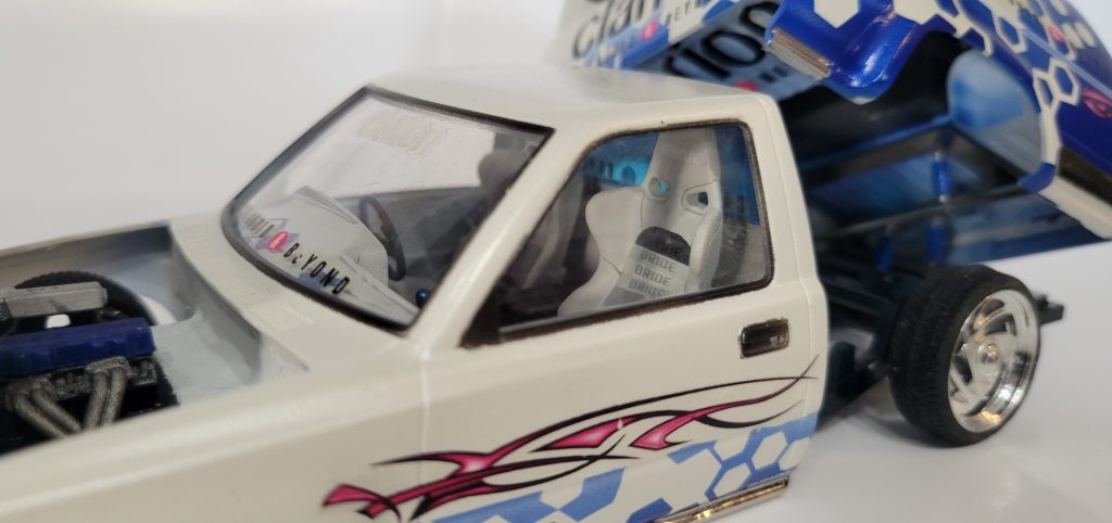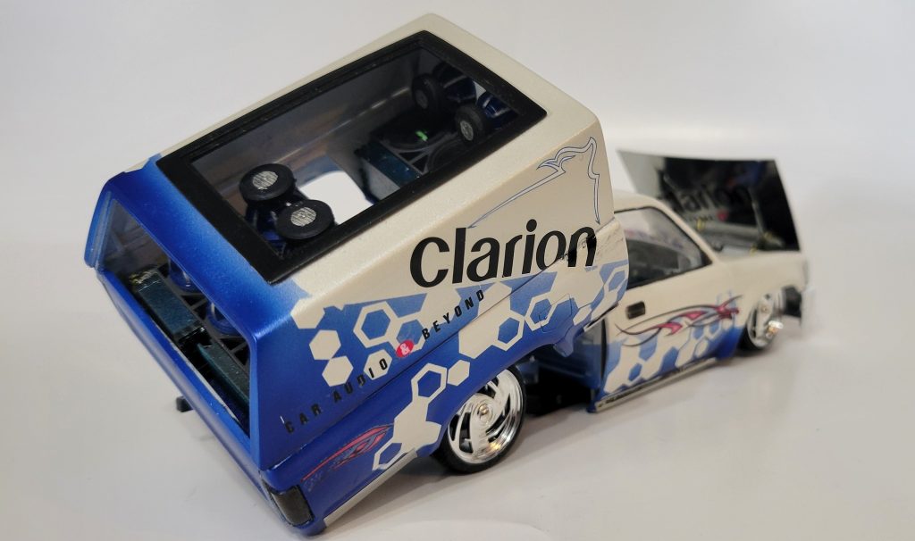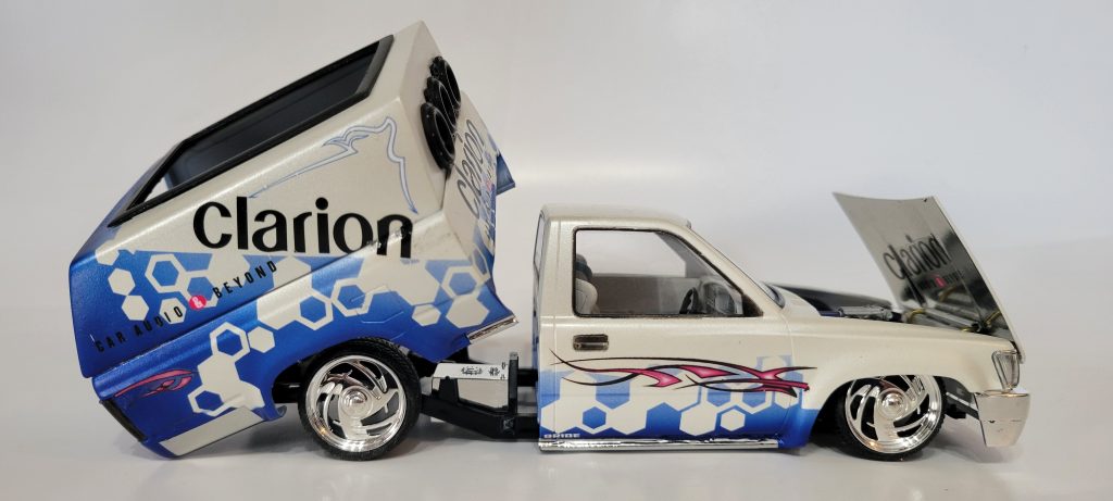 Aoshima’s Hilux mini truck kit. Added a 3d printed 22re, a ton of 3d printed speakers, and printed bed tilt mechanism.