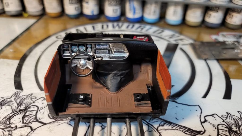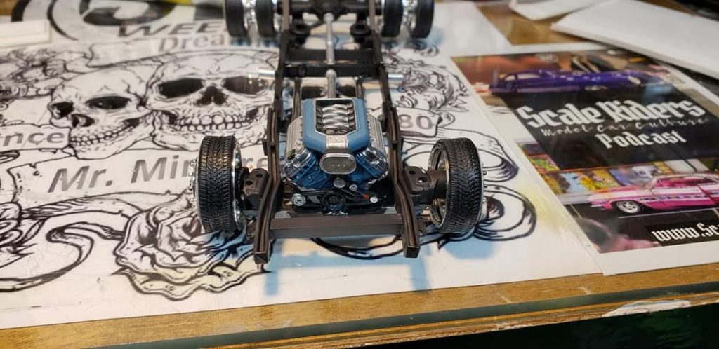 It holds a 2014 mustang coyote motor, custom photo etch grille drilled out molded in plastic headlights and replaced with clear lenses. Hood is hinged and wheel are from a mobius tractor-trailer with revell tuner tires . The paint is a custom mixed DUPONT blue then the club sticker was added the it was clear coated with 5star urethane clear.