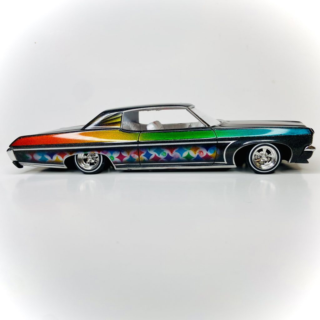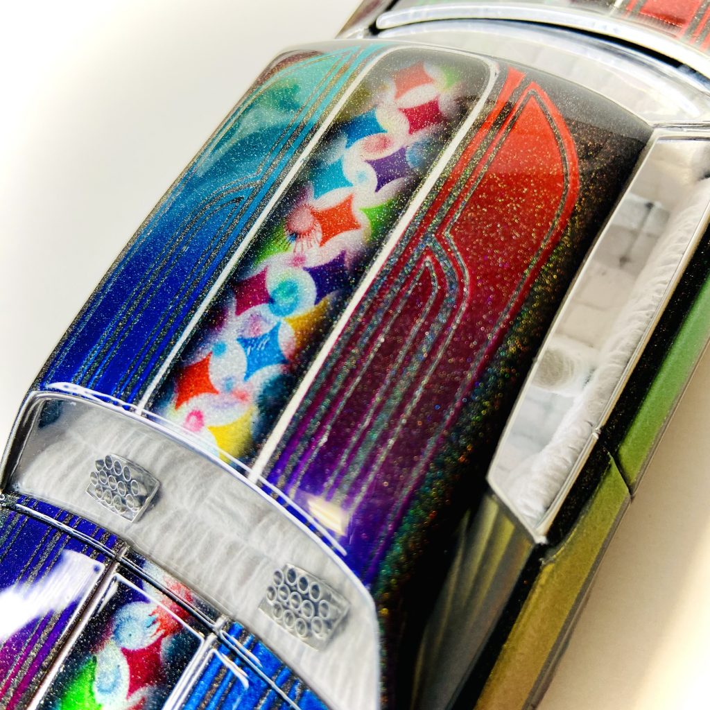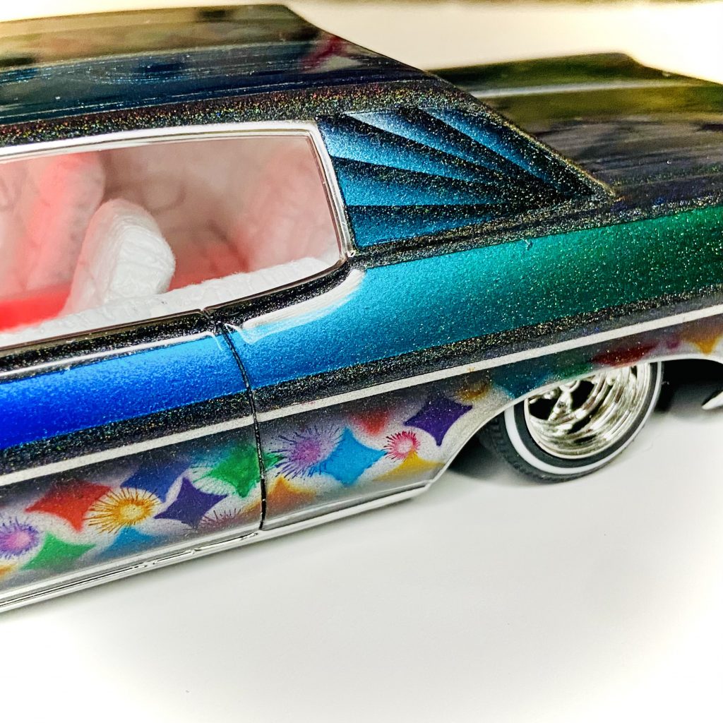 Early 70s lowrider. 14 inch Cragars on 5.20 premium sportways. Full custom interior sculpted out of polymer clay then flocked white. The console is a functional color bar. Custom front end and lots of wild paint.