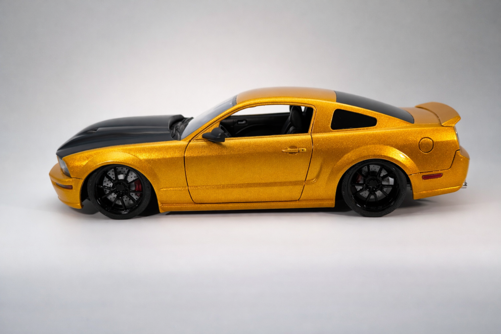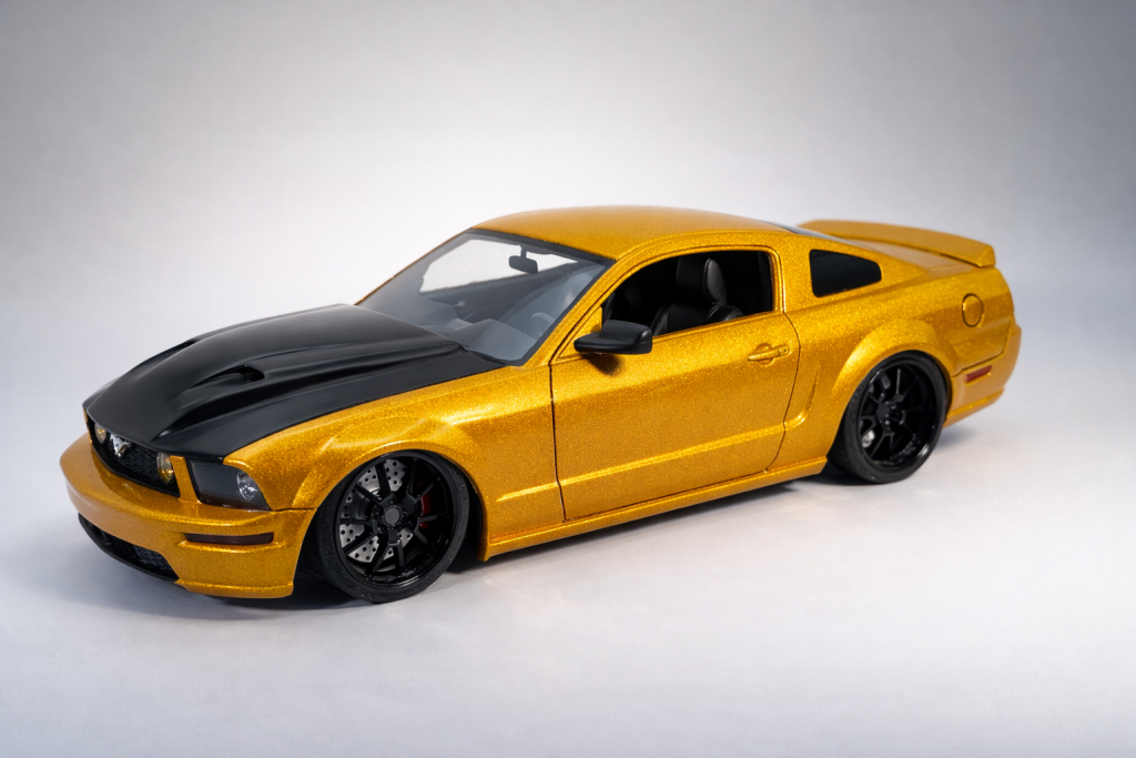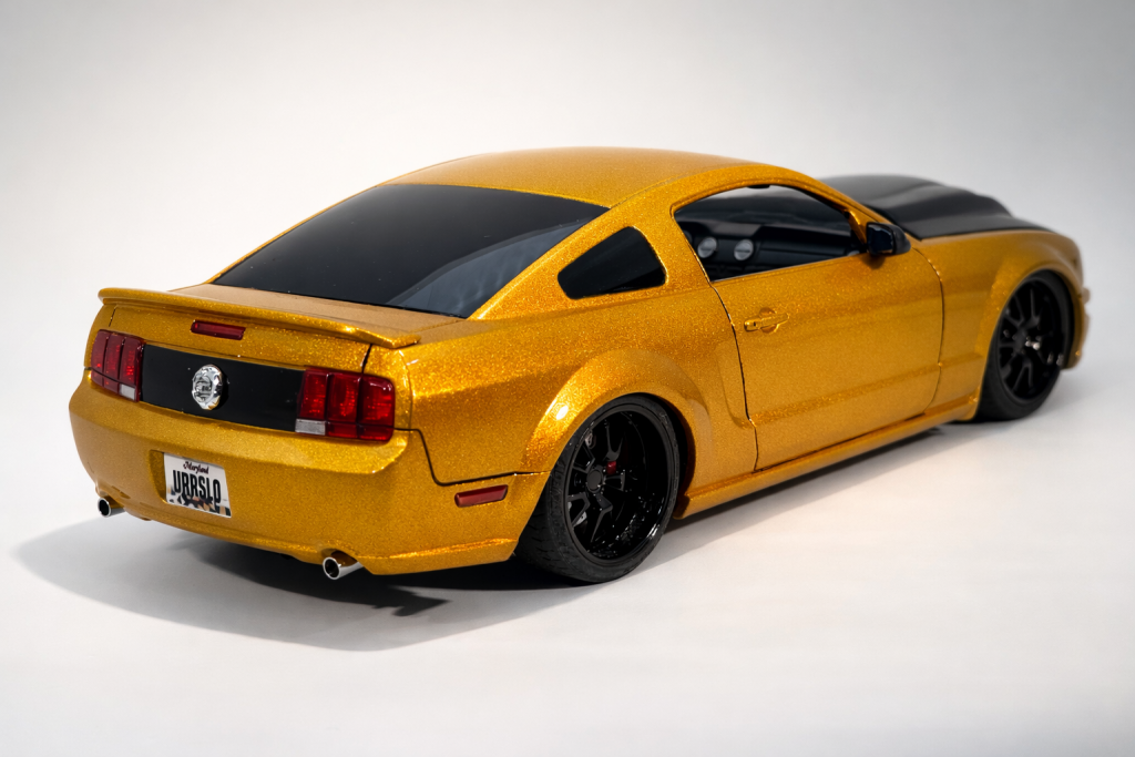 Testors Inca Gold and Testors wet look clear. Texas 3D customs printed FR500 Wheels & Pegasus brake rotors. Custom hood graphed super stallion hood on the ’05 Revell GT hood. Black deck decal between tall lights. STS Decals custom license plate “URRSLO”