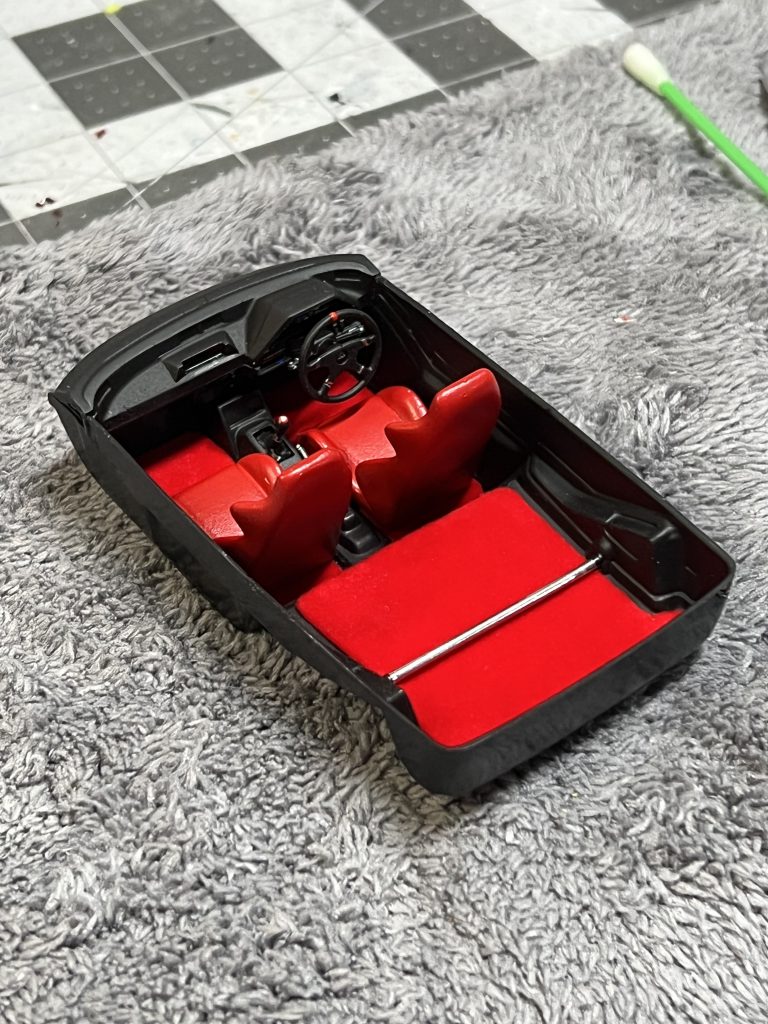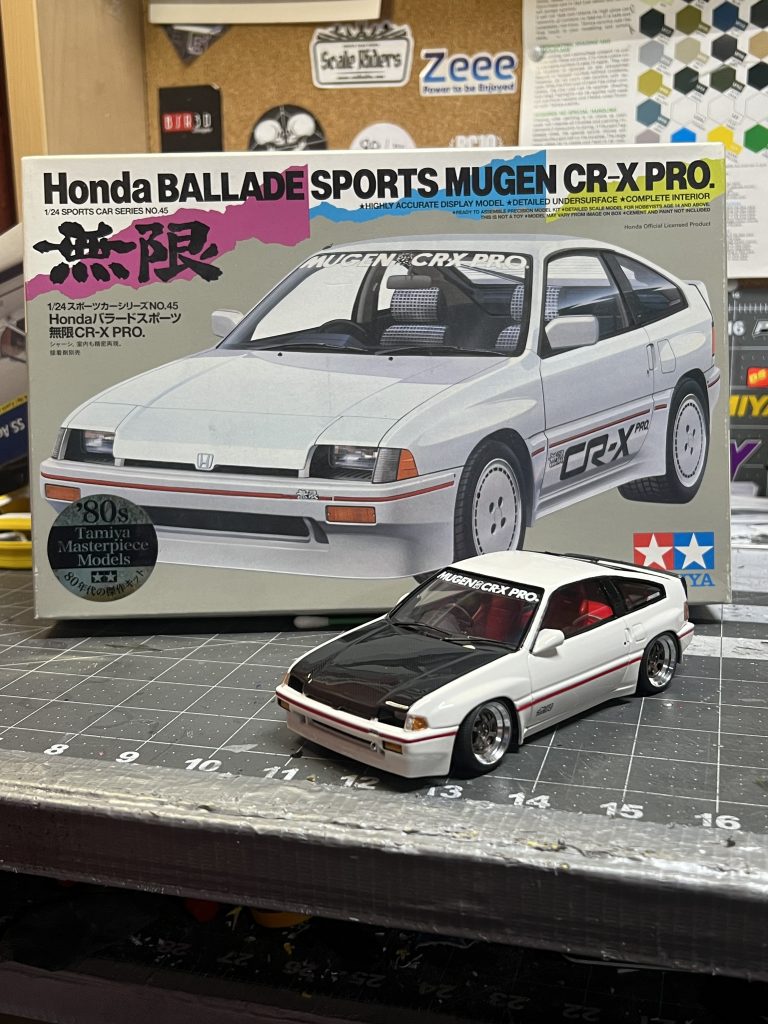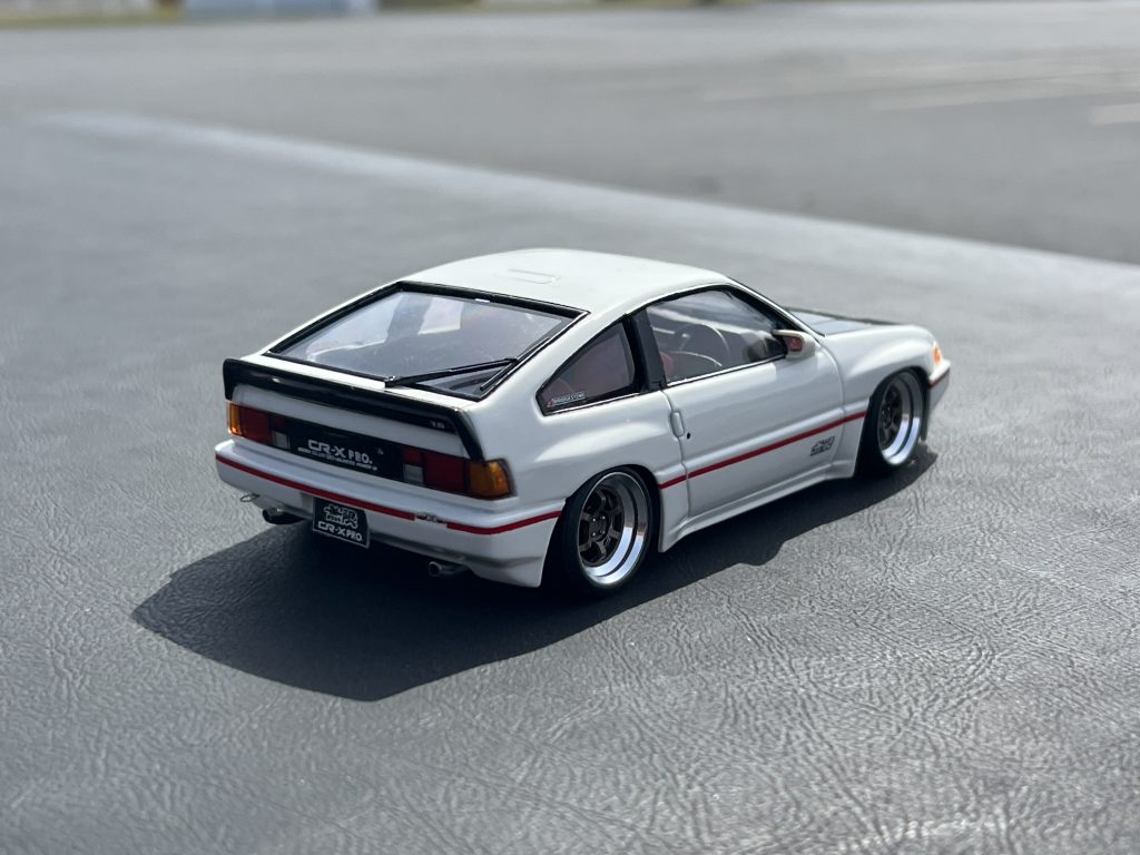 This started as an 1984 issue of the Tamiya Honda CR-X Pro Ballade Sports Mugen. Ryan lowered the car, removed the side exhaust and scratch build a Mugen Dual exhaust with metal tips, added an intercooler, Recaro seats, zoom on recaro decals, velvet like carpets, rear strut bar, Zoom On 16” TE37 wheels and tires, converted the hood to a long hood and finished it and the rear spoiler in Zoom On carbon fiber. Exterior Paint is splash paints championship white, TE Bronze for the wheels and cleared with Axalta 2k air bake clear and interior paint is Tamiya matte black and Italian red with flat clear.