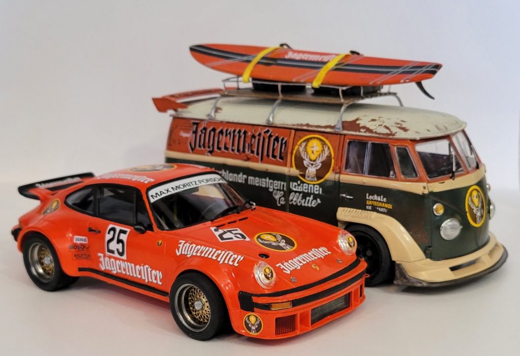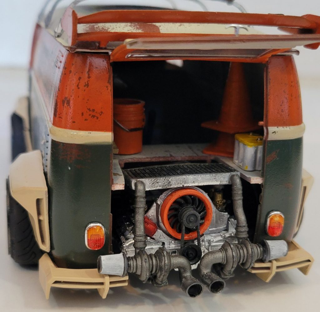 Kit started as the Revell T1 Panel Van. Added a blackbox widebody kit. Used the hairspray chipping method to the paint. Weathered the decals to match the paint. 3d printed front seats, blackbox turbo motor, and a ton of “junk” and parts on the inside on the work bench I added. Made this as a support truck to the Tamiya 911 in the same livery.