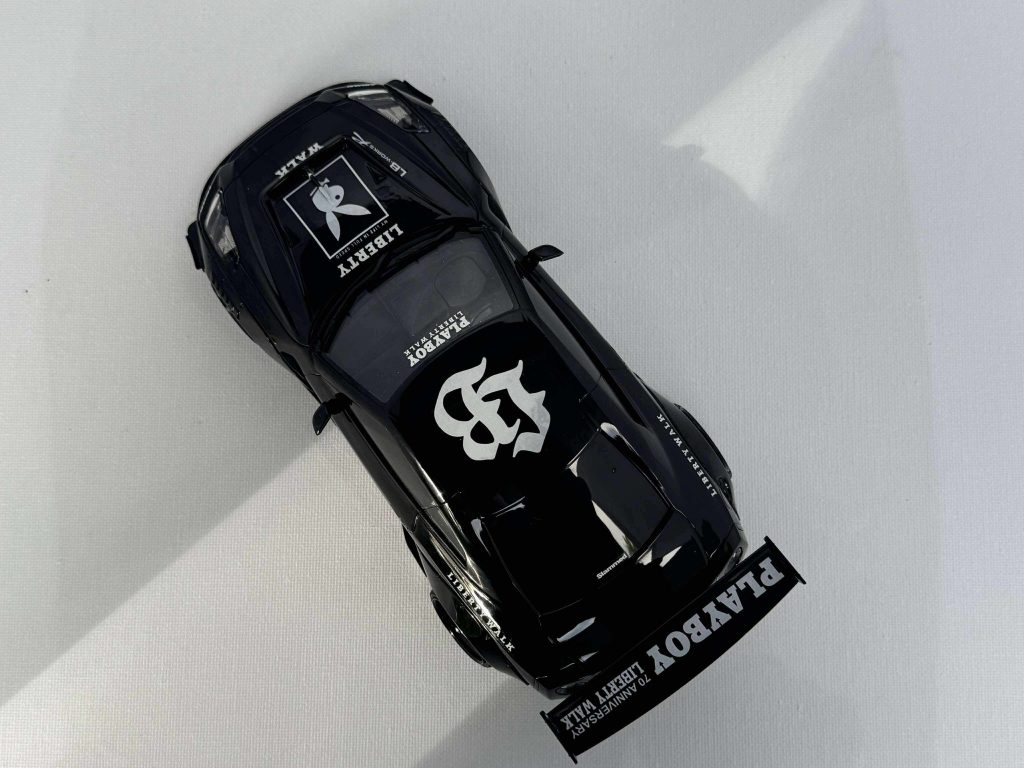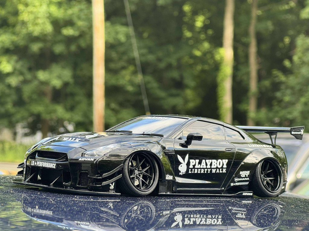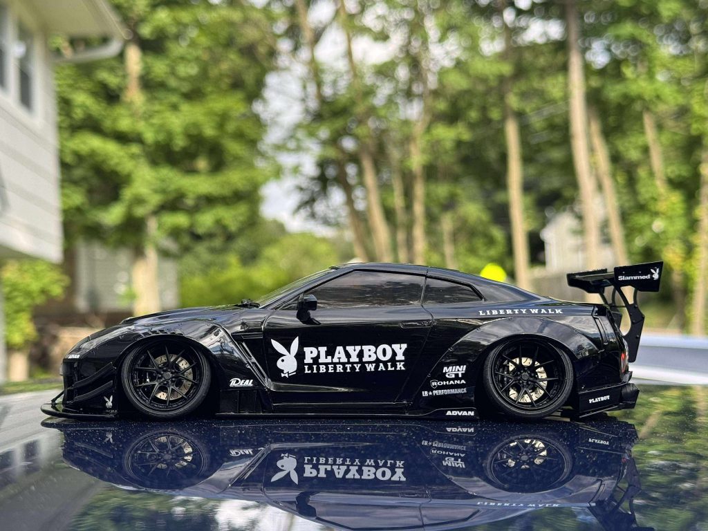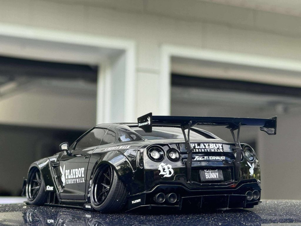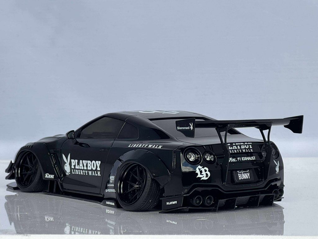 Mostly box stock, lowered suspension, photo etch brake rotors, custom wheels from LB works silhouette R35GT-RR kit. This model was inspire by a 1:1 LBW R35.