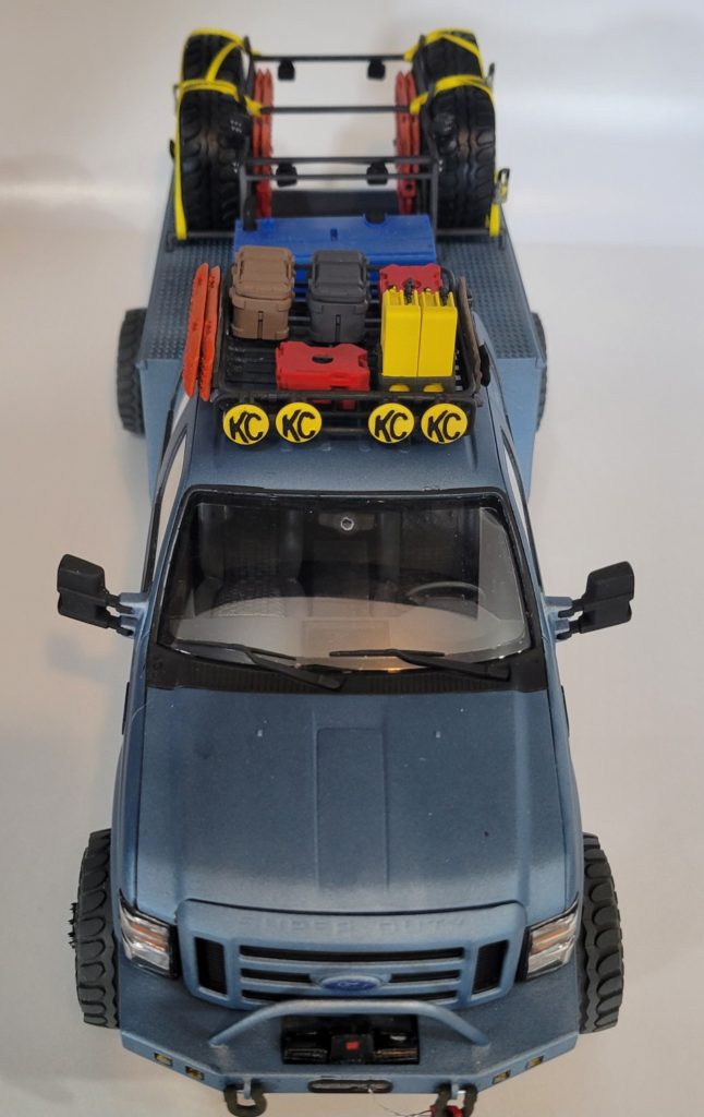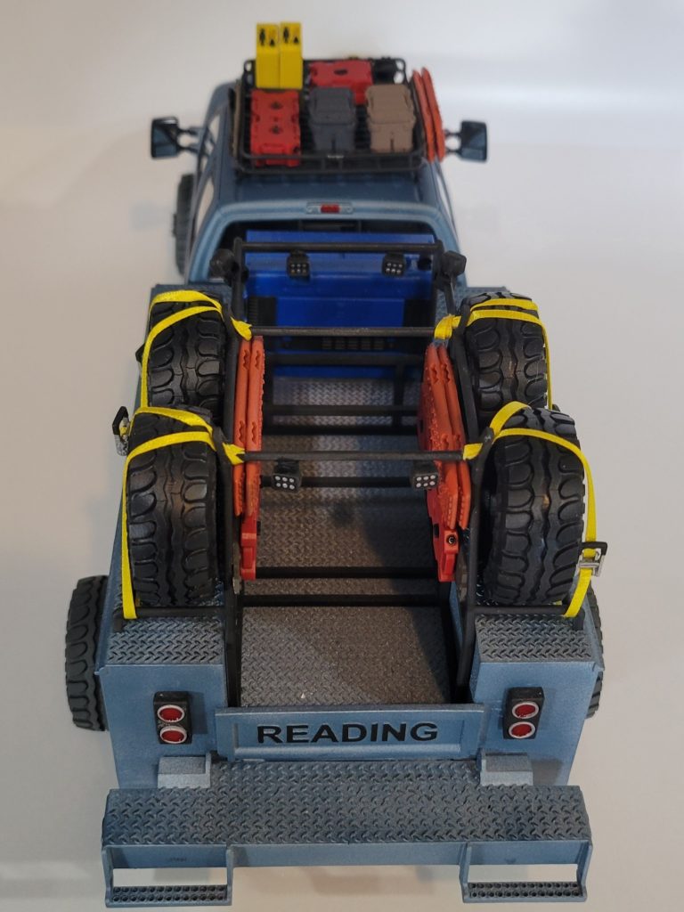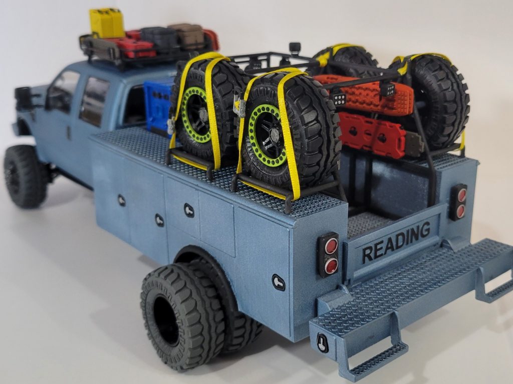 Kit started as a sealed MENG f350 truck. I immediately starting chucking parts back in the box, and cut the frame in half to match the wheelbase of the 3d printed utility body. My best bud in this hobby Matt designed the tire rack for the utility body. The motobas supercharged coyote 5.0 fit so well in the truck and looked at home. All the tires, the welder, traction boards, gas can, poseable sidesteps, even the ratchet strap mechanisms are all Scale Speed Garage files 3d printed in house. Painted in scale finishes Ford metallic blue. This idea was spawned by Vaughn Gitten Jr.’s baja 500 chase truck.