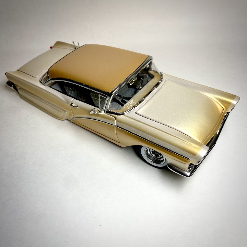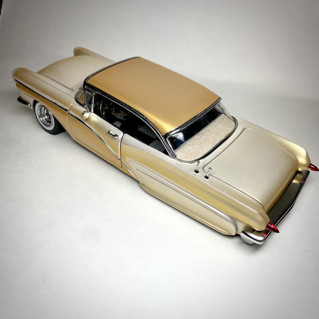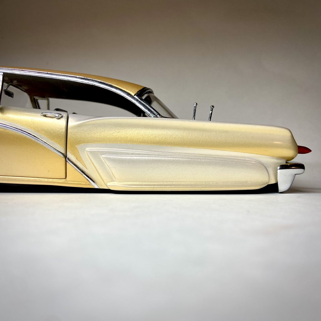 1958 Impala grill and bullets. The fins were shortened and rounded. I used headlight buckets flipped backwards to house the 1959 Cadi taillights. The rear bumper is a 1957 Desoto front grill and bumper flipped upside down. Frenched dual antennas and a 4 seat bucket interior with matching console in black and white diamond tuck. The paint is pearl white and gold with a partial panel paint job similar to the Watson style and a mold fade away similar to the Winfield fade. Deep dish steelies on white walls finish it off.