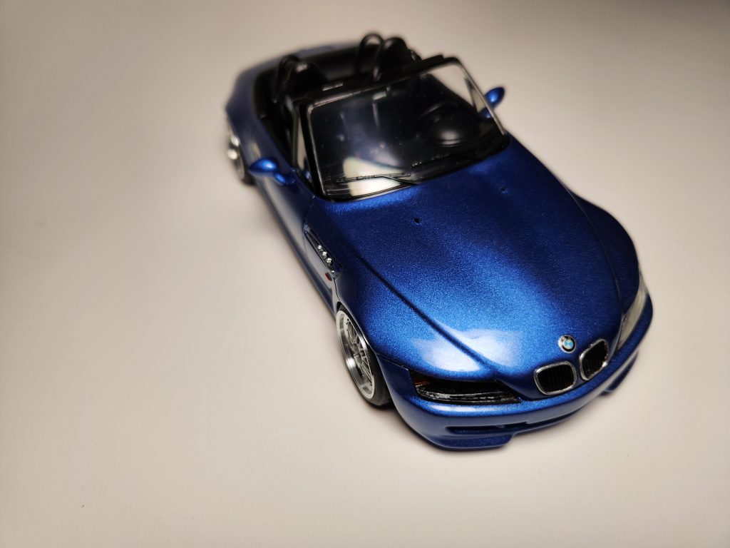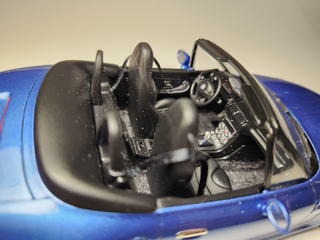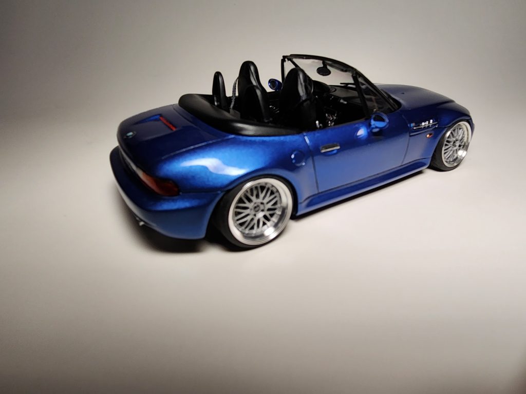 1999 BMW M Roadster. Slammed suspension. BBS LMs by Scale Production. Scratchbuilt center console gauges, climate control dials, BMW Motorsports shifter, e-brake handle, and pedals. Paint is OEM Estoril Blue by Scale Finishes. Also scratchbuilt the Eisenmann exhaust system.
