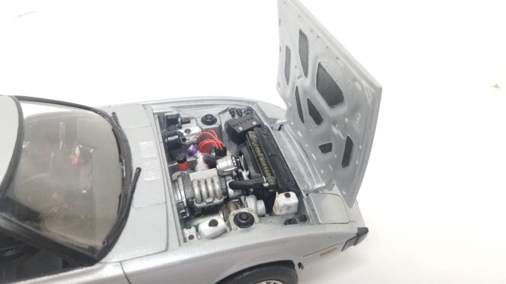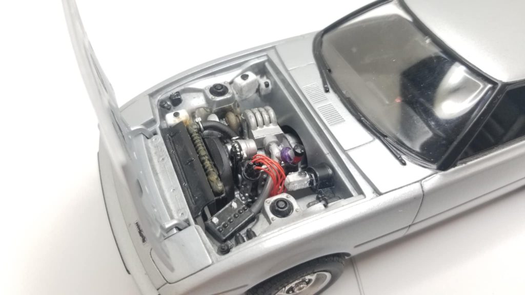 He also had to modify the intake manifold to except the charge pipe correctly, added spark plug wire and dizzy, gave it an autometer monster tach and momo steering wheel, topped it off with Tamiya silver paint with a good buffing…