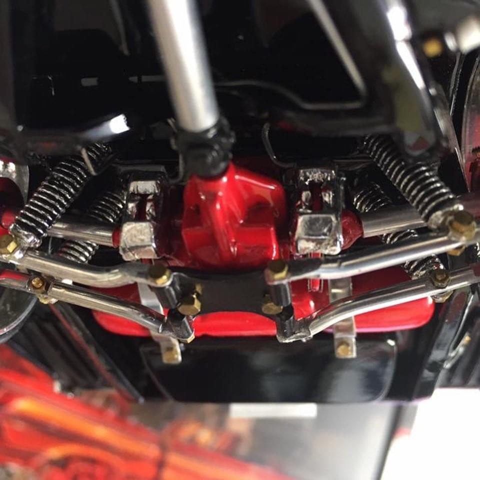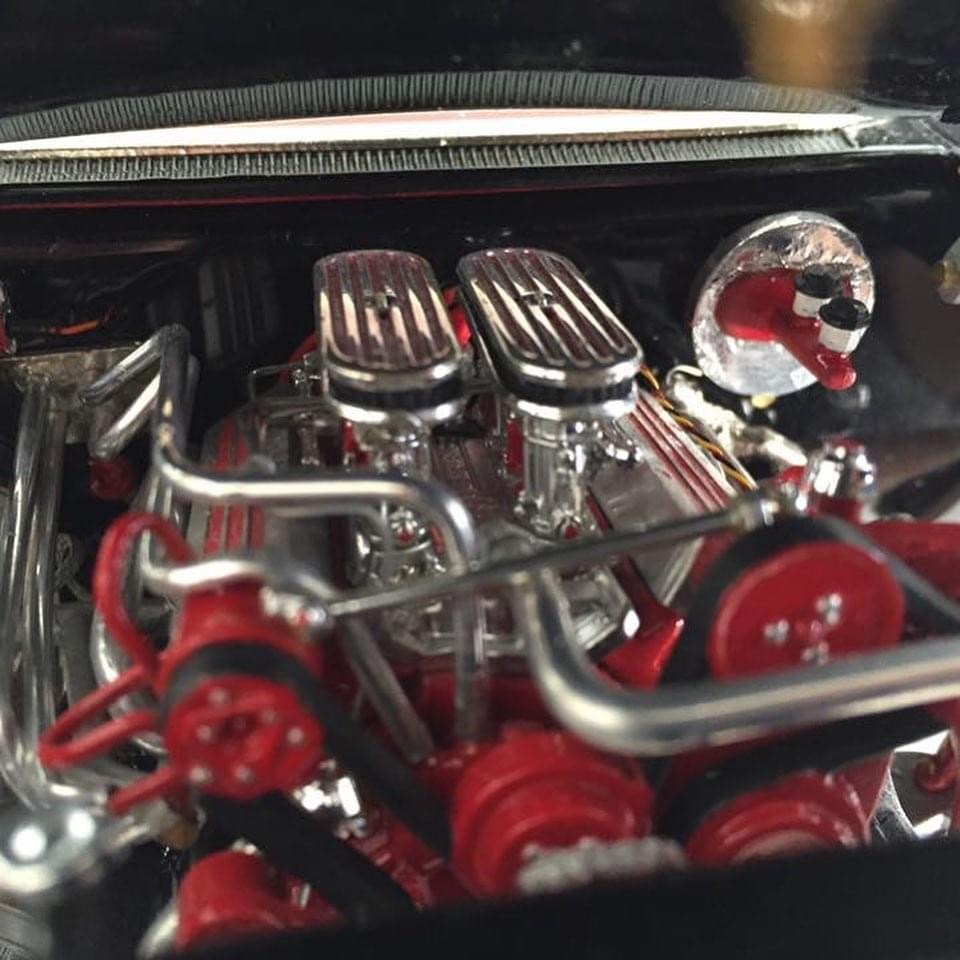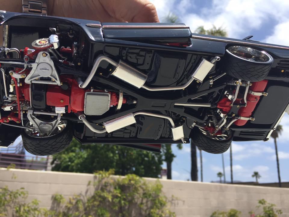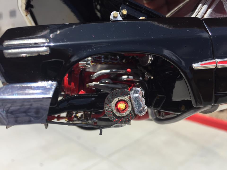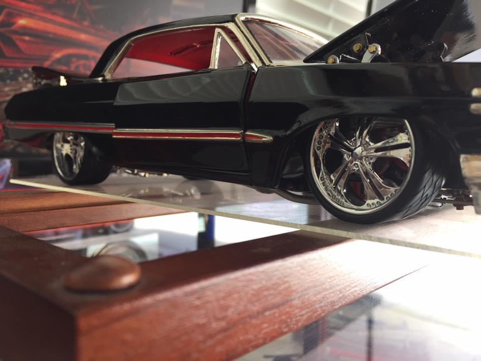 Santiago 1/16th scale 1963 Impala Low Rod He scratch built. He started with the frame pan core support firewall interior and trunk kit . This was a 1:18th scale R/C Body I used from a “Hopp’n Hydros” toy by Lindbergh Hawk Model Company. The motor trans and intake with carbs are from the Revell 1/16th scale 1934 coupe kit and the reared is from the Revell 1/16th scale Phantom Kit and I modified it to fit my scratch built frame. The rims and tires are from a 1:18th scale DieCast car I got from my Club Prez of MCBA Anthony Rios aka “ Mr. Biggs” . The dash center console door panels and rear panels headliner all scratch built and opened the glove box and center console lid for a realistic look. Also added a pioneer flip up t.v. Head unite with remote control and it pull out flips up and closes just like the real one. Working front and rear suspension and opened the gas tank door and scratch built the chrome trim to add a classic impala look. 1984 corvette radiator with fan and shield from the Revell 1/16th scale kit from my parts box. Mr. Biggs Painted Candy Raven Black for me as I was laid up in bed from a bad car accident a month after Santiago started to scratch build this impala. He chose a fire engine red interior motor trans and trunk with polished aluminum and chrome trim to finish it off with the Low Rod stance. Opened the hood with working hinges and pop up spring for the realistic look. Hand formed headers and aluminum exhaust with chrome mufflers. Plumbed and wired the motor. He added photo etched “Super Sport” on the rear side trims. This build took me 11 months with the help of my father “Big Jim Hernandez “ who was my inspiration for building this impala. He helped me scale it out from original blueprints off the internet. I call this build “3 the hard way” as Biggs mentioned to me “ 3 years of planning this build Santi! That’s what you should call it!” Our V Prez “Roger Chavez” said it was the best scratch build he has seen from our club brothers! May He Rest In Peace. Hope you all like this build. Mr.1/16th Santiago from San Diego