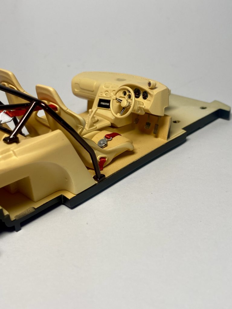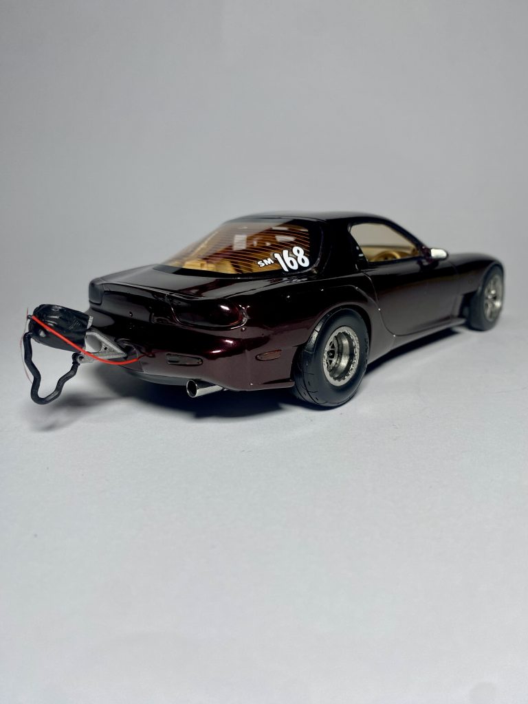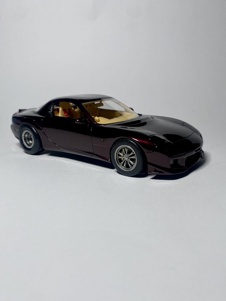 I started with a fantastic Alpha Model RX7 . I 3D printed some ZForce Modelworx wheels and tires . I also 3D Blackbox stl roll cage for it and the harness buckles . Paint is Firescale Modeller Black Cherry finished with their 2K clear . I also used Firescales interior paints