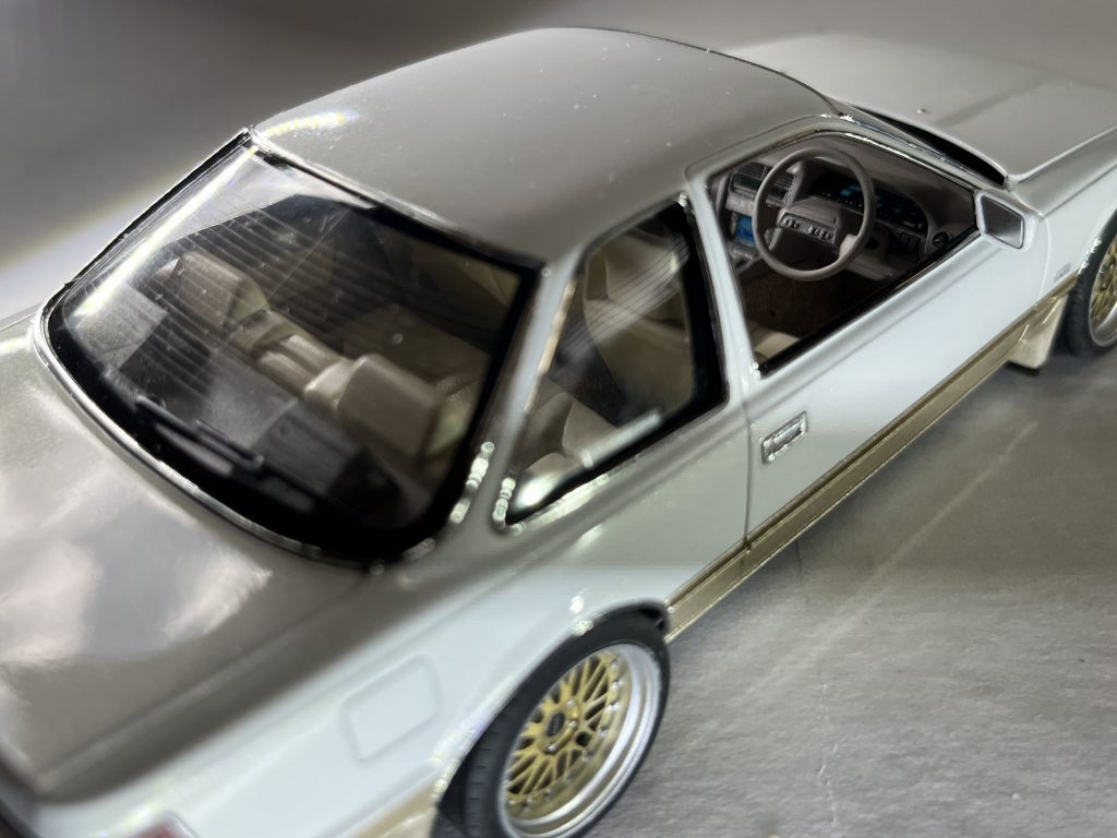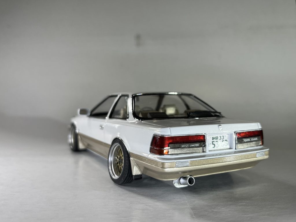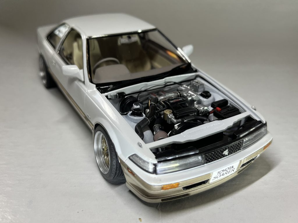 Toyota soarer kit. Engine wiring and interior details (flocking and belts). Kei Office 3D parts. Suspension, brake components. Also muffler, lip spoiler, and printed BBS LMs also from Kei Office. Two tone pearl white and beige with 2k clear. Hasegawa bright finish foil trim added.