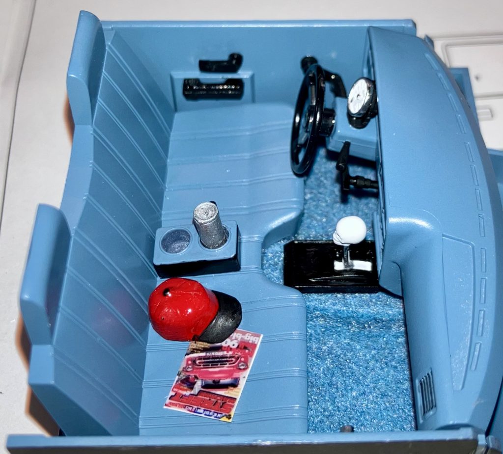 Wired tach – cup holder with coffee mug – magazines – baseball cap on seat